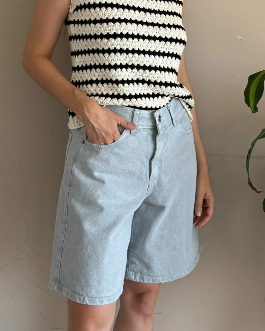 Bermuda tiro alto confeccionada en gabardina rígida en tono verde agua. Sus costuras son a tono y cuenta con avíos níquel opaco.