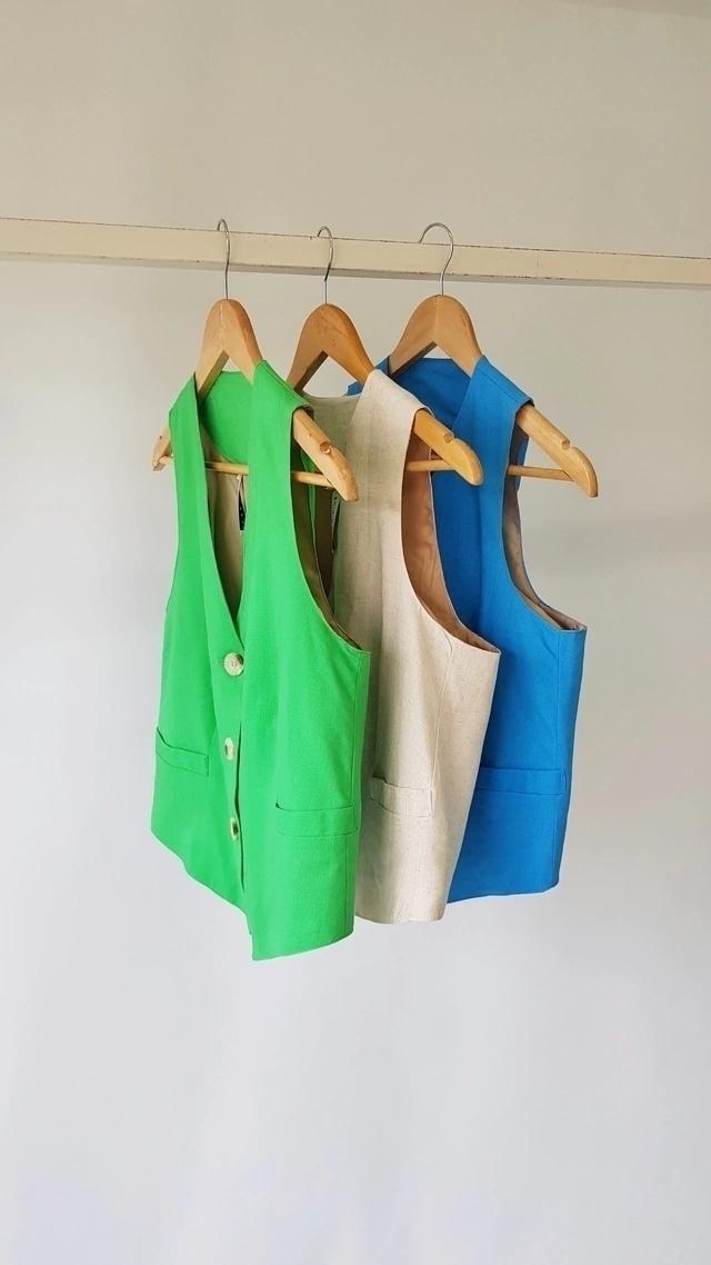 Chaleco de lino estilo sastrero. Esta totalmente forrado, todos los tonos con forreria beige (salvo el negro con forreria a tono) y tiene vistas internas que le aportan una buena terminación, también presenta vivos de bolsillo en el delantero y tres botones con ojal para cerrar la prenda.