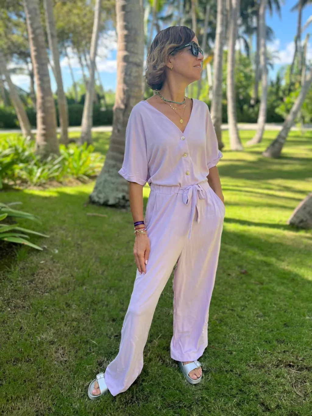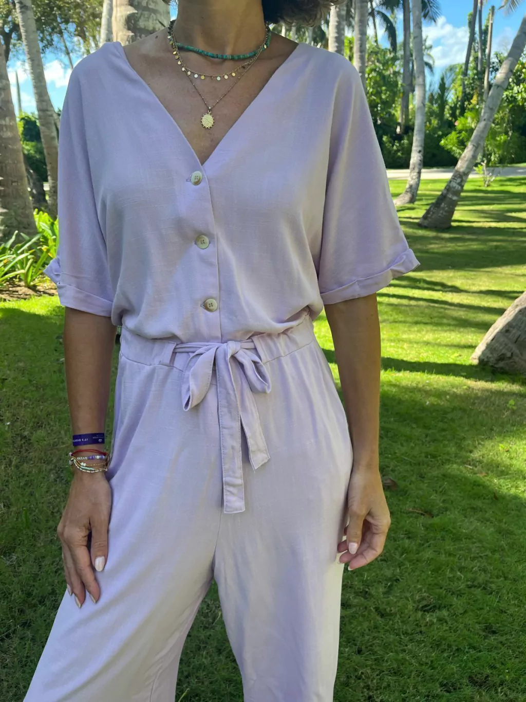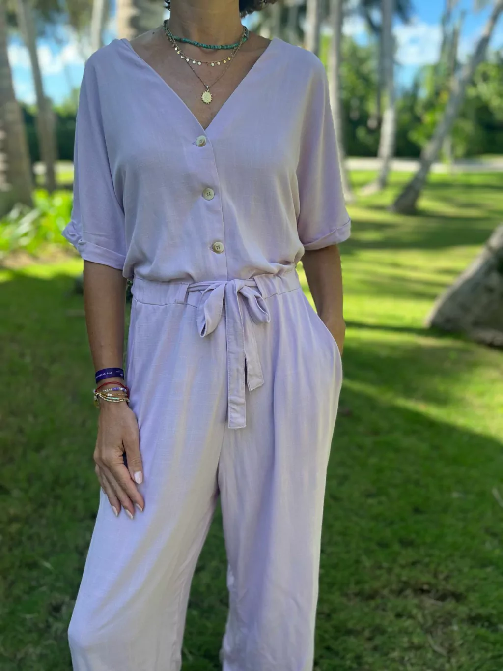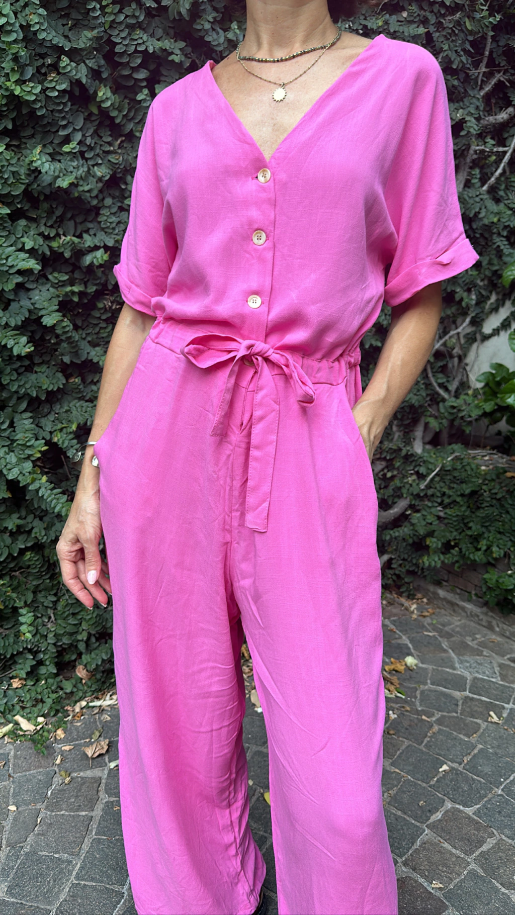 Mono de rayón slub liso. Tiene escote en V y cartera con botones. También un lazo en la cintura para entallar.