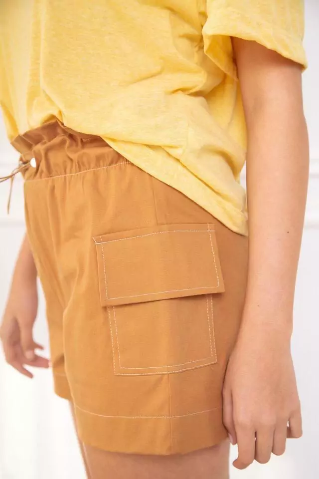 Short confeccionado en gabardina de tiro alto, con costuras a contratono y bolsillo plaqué con tapa en el lateral.