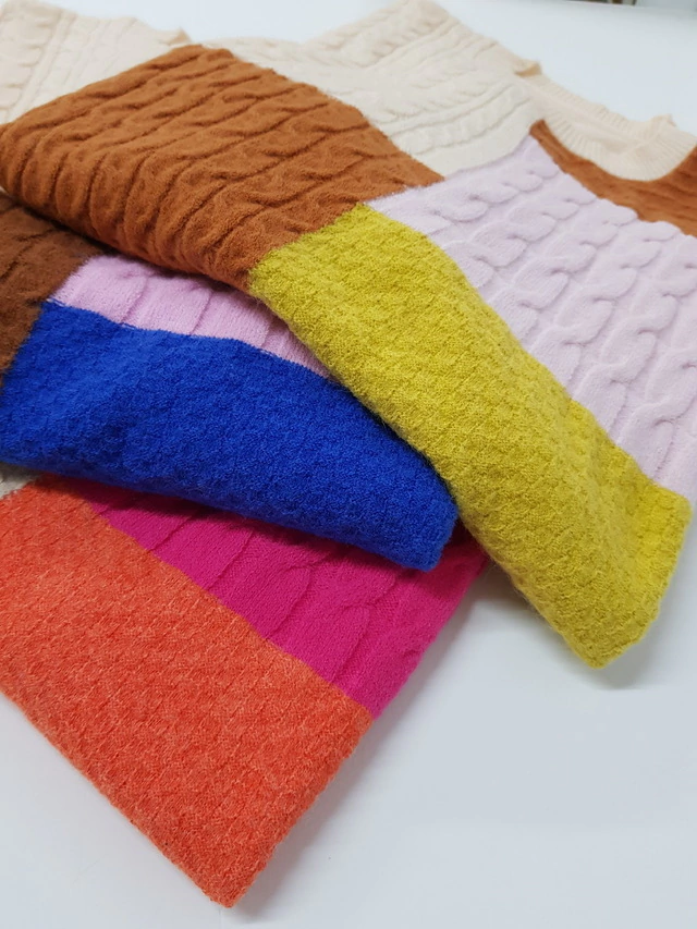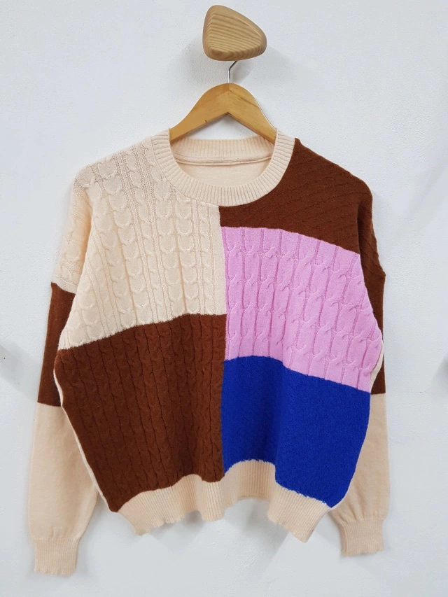 Sweater con patch en distintas texturas. De dibujos geométricos en bloques de color y variedad de trenzas. Fit amplio, con hombros caídos y cuello redondo.