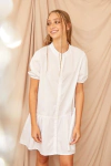 Tiene cuello mao, y un recorte con frunces en la cadera.