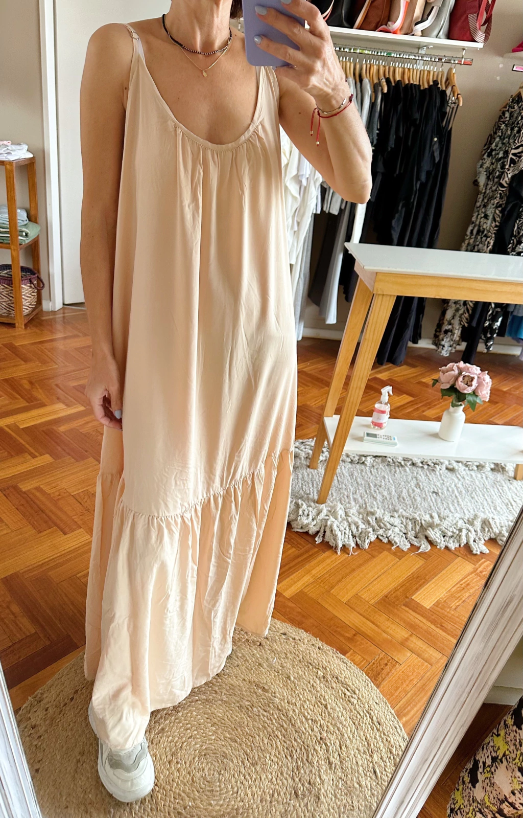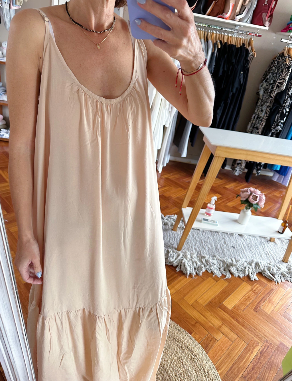 Vestido largo y amplio confeccionado en fibrana lisa. Con espalda baja fruncida, reguladores y recortes en el bajo de la prenda.