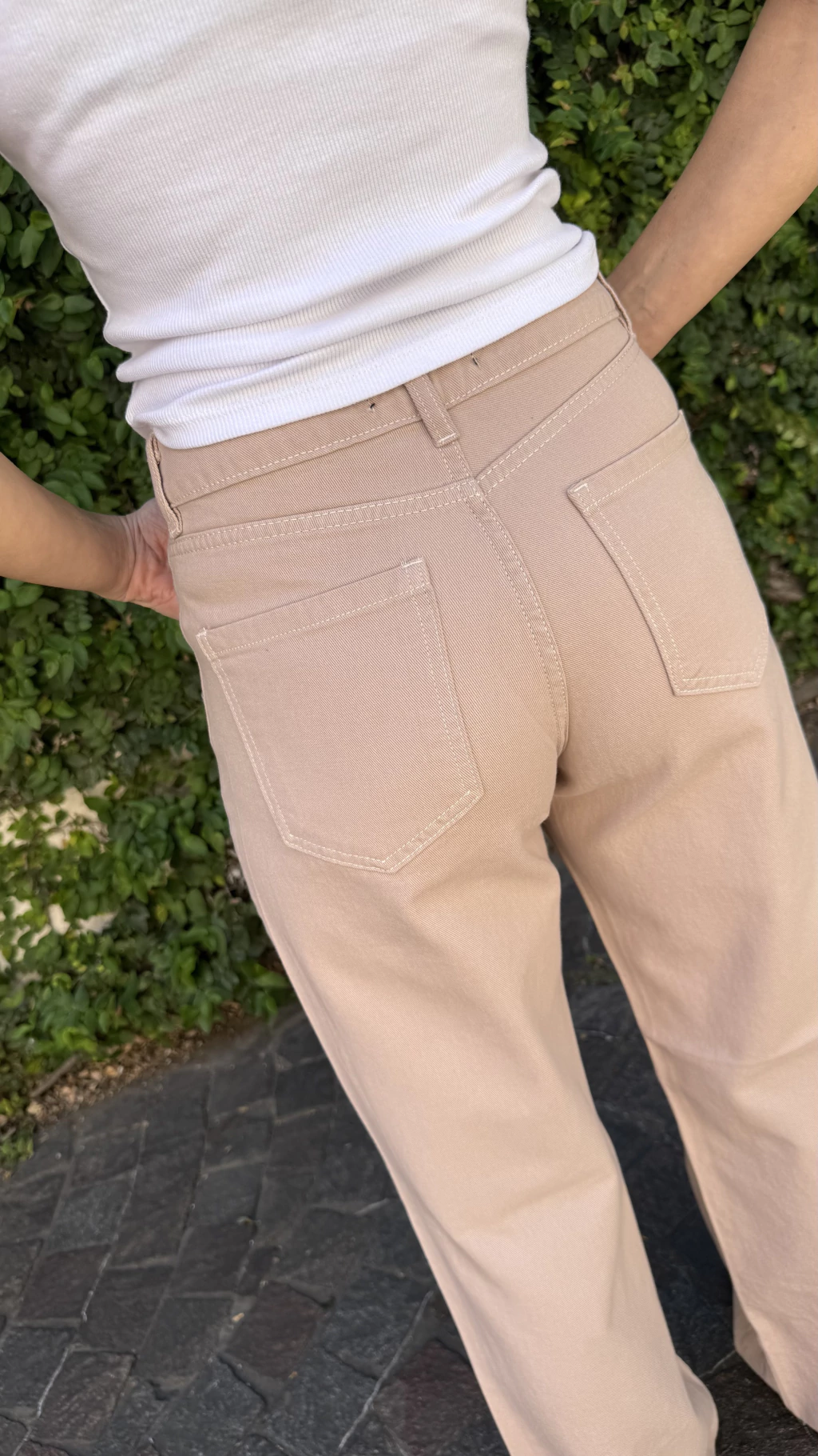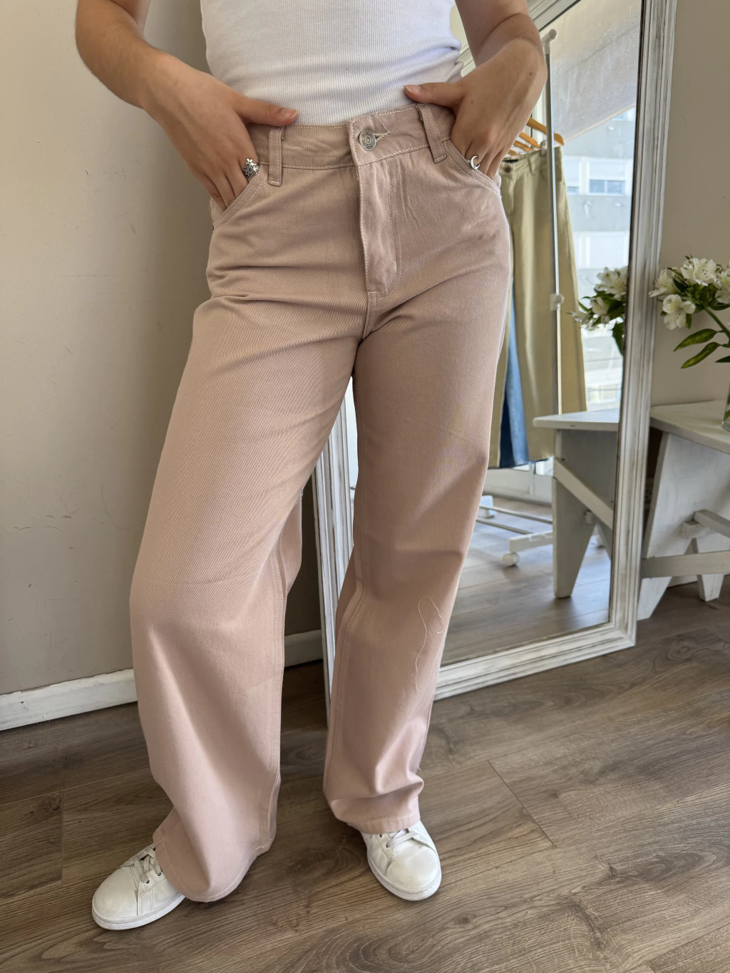 Pantalón de gabardina rígida calce wide leg, tiro alto. Es color rosa pastel, tiene las costuras a tono, los avíos níquel viejo y el ruedo clásico.
